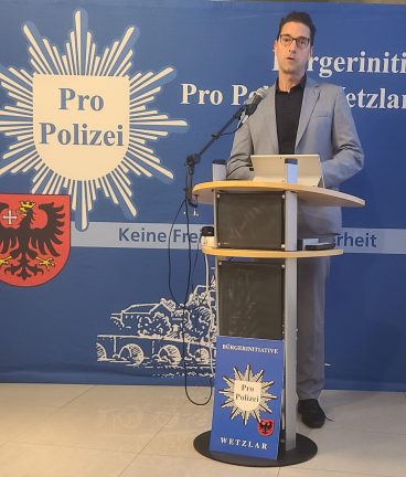 Pro-Polizei-Präsident Hans-Jürgen konnte rund 100 Besucher begrüßen, darunter MdL Dr. Matthias Büger, Schöffengrunds Bürgermeister Michael Peller, den Landesvorsitzenden der Deutschen Polizeigewerkschaft, Alexander Glunz, den Leiter der Polizeidirektion Lahn-Dill, Udo John, sowie die ehemaligen Wetzlarer Polizeichefs Horst Nies, Holger Geller und Werner Bursik. In seinen einführenden Worten wies Irmer darauf hin, dass bundesweit im letzten Jahr rund 100.000 Angriffe auf Polizeibeamte, Feuerwehrkameraden, Bundespolizisten sowie Vertreter der Rettungsdienste verübt worden seien. Jeder Angriff auf Polizeibeamte sei ein Angriff auf den Staat, denn Polizei repräsentiere den Staat. Sie habe das Gewaltmonopol übertragen bekommen. Deshalb müsse die Politik reagieren, da die Zahlen leider deutlich zunehmen würden.
