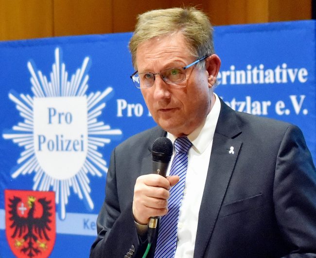 Staatssekretär Stefan Sauer bei Pro Polizei IT Ausstattung der hessischen Polizei (wf). Stefan Sauer, Staatssekretär im Hessischen Ministerium des Innern und für Sport dankte zu Beginn seines Referates in der Solmser Taunushalle der einladenden Bürgerinitiative Pro Polizei Wetzlar e. V. für deren zivilgesellschaftliches Engagement zugunsten der Polizei und übergab zugleich einen Förderscheck über 500 Euro…